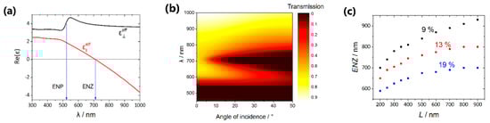 Calculation results. (a) Spectra of the permittivity components (black curve) and (red curve) for the sample s50_289 nm with volume fractions of air, alumina, and metal of about 11%, 76%, and 13%, respectively. The nanorods length of 290 nm was taken; (b) angular-wavelength transmission spectrum for the sample s50_289 nm; (c) dependence of the ENZ spectral position on the length of the nanorods, the volume fraction of alumina is 76%, the volume fraction of gold is 9% (black points), 13% (red points) and 19% (blue points).