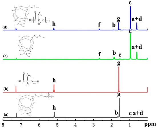 In order to investigate the chemical structure and composition, 1H-NMR spectroscopy was performed on the fabricated PLLA-AMPOSS intermediate, neat PLLA, AMPOSS, and simple blend of PLLA and AMPOSS, as shown in Figure 2a–d, respectively. All protons of AMPOSS and PLLA have their own characteristic signals under 1H-NMR spectroscopy. AMPOSS (CDCL3, ppm) and PLLA resin have two main signals, (SiCH2CH(CH3)2 0.95) and ((SiCH2CH(CH3)2, SiCH2CH2CH2NH2 0.61), and (OC(CH)CH3O 1.58) and (OC(CH)CH3O 5.17), respectively. Therefore, the resonance signals that appeared at 0.95, 0.61, 1.58, and 5.17 ppm, shown in Figure 2d, can be attributed to the peaks c and a + d of AMPOSS nanoparticles and g and h of PLLA resin, respectively. Hence, for the simple blend of PLLA/AMPOSS, the signal can be viewed as a simple sum of its components. However, there is a distinct difference in the signals between the PLLA/AMPOSS blend the PLLA-AMPOSS intermediate, although the content of AMPOSS is close in both. Compared to the results shown in Figure 2d, almost all the main signals of AMPOSS can be found to have shifted and weakened for the PLLA/AMPOSS0.50 intermediate, as shown in Figure 2a, indicating that the chemical reaction occurred, and the detected signals can be attributed to the resulting ring-opening polymerization products. It can be further verified that the weak peaks f and e of AMPOSS nanoparticles cannot be detected in Figure 2a at all. According to a suggestion by Liu. et al. [,], the occurrence of the signal shift and reduction shown in Figure 2a should be attributed to the effect of ring-opening polymerization between the PLLA resin and the AMPOSS particles. Therefore, it can be concluded that the PLLA-AMPOSS intermediate consists of ring-opening polymerization between the PLLA resin and the AMPOSS particles.