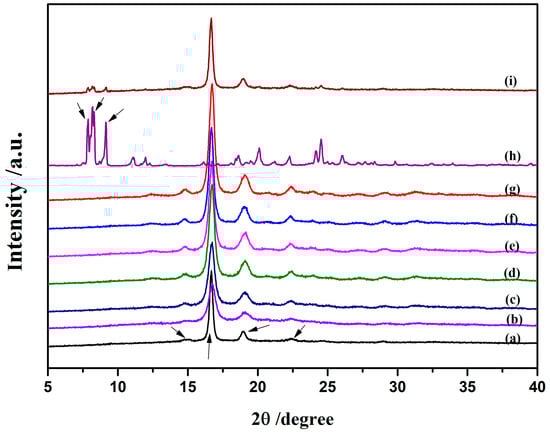 Figure 3 shows the X-ray diffraction patterns of the neat PLLA and PLLA-AMPOSS intermediates with different contents of AMPOSS. As shown in Figure 3a, the strong peaks located at 2θ of 16.8° and 19.0° as well as the weak peaks at 15.0° and 22.5° are typical X-ray diffraction peaks of PLLA, which agrees well with the data reported in []. For the AMPOSS nanoparticles, the characteristic peaks were found at many angles, especially the presence of strong signals of 2θ between 6.0° and 9.0°, which can be seen in Figure 3h. It can be seen in Figure 3i that almost all the characteristic peaks of PLLA and AMPOSS can be observed for the simple physical blend of PLLA and AMPOSS (1.0 wt%). This is expected because there is no chemical reaction between the PLLA resin and the AMPOSS nanoparticles. However, it can be also observed from Figure 3b–g that almost all the characteristic diffraction signals of AMPOSS (especially 2θ between 6.0° and 9.0°) were not detected in the PLLA-AMPOSS intermediate at all, no matter how many AMPOSS nanoparticles were incorporated. For PLLA-AMPOSS0.02–PLLA-AMPOSS0.20 intermediates, the undetectable characteristic peaks are easy to understand and may be attributed to the low content. However, for PLLA-AMPOSS1.0, the content of AMPOSS actually exceeded that in the PLLA/AMPOSS blend (1.0 wt%), and the lack of characteristic peaks suggests that the AMPOSS molecule reacted with the PLLA resin. The effect of ring-opening polymerization is thus confirmed. It is also found that the intensity of PLLA peaks increased with increased AMPOSS content, which indicates that the crystallinity of PLLA in the crystallization process increased with increased AMPOSS nanofillers, although the crystalline structure of PLLA was not affected more by the fillers.
