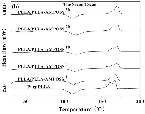 The thermal properties of neat PLLA and PLLA/PLLA-AMPOSS nanocomposites were first collected by DSC, as shown in Figure 4. Some information can be obtained from Figure 4, including the glass transition temperature (Tg), the melt peak temperature (Tm), the cold crystallization temperature (Tcc), and the enthalpy of the cold crystallization process (ΔHcc), which are summarized in Table 1. It can be found that no cold crystallization peaks are detected, whereas melting peaks existed for all tested specimens in the first scanning, as shown in Figure 4a. This is attributed to the crystallization being completed during the dissolution and precipitation of the neat PLLA resin and the PLLA/PLLA-AMPOSS nanocomposites. Compared to the results in the first scanning, the plots of heat flow vs. temperature show different peaks in the second scanning, as shown in Figure 4b. First, a fluctuation of the PLLA/PLLA-AMPOSS nanocomposites at a temperature of 60 °C can be easily observed, and it is known to be the Tg. Second, the cold crystallization peaks at a temperature of approximately 110 °C can be also found for both the neat PLLA resin and the PLLA/PLLA-AMPOSS nanocomposites. Finally, two melting peaks can be clearly observed, and are generally believed to be caused by the two phases of the PLLA crystals [].