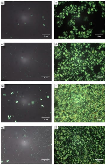 Polarized optical microscopy of crystallization process of PLLA/PLLA-AMPOSS with different PLLA-AMPOSS content and crystallizing time at 125 °C: (a) PLLA/PLLA-AMPOSS1, 40 s; (b) PLLA/PLLA-AMPOSS1, 300 s; (c) PLLA/PLLA-AMPOSS10, 40 s; (d) PLLA/PLLA-AMPOSS10, 300 s; (e) PLLA/PLLA-AMPOSS20, 40 s; (f) PLLA/PLLA-AMPOSS20, 300 s; (g) PLLA/PLLA-AMPOSS30, 40 s; and (h) PLLA/PLLA-AMPOSS30 300 s.