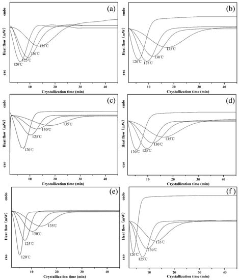To further clarify the accelerated effect of PLLA-AMPOSS intermediate, the DSC spectrum of isothermal crystallization behavior of neat PLLA and PLLA/PLLA-AMPOSS nanocomposite is shown in Figure 6. In Figure 6, the heat flow is expressed as a function of time. The samples were melted at various temperatures ranging from 120 to 135 °C, which is an isothermal crystallization process. It can be seen in Figure 6 that a high crystallization temperature (Tc) leads to a slow crystallization process, and vice versa, no matter what the content of PLLA-AMPOSS intermediate is. A delay of crystallization induced by increased crystallization temperature is expected. It is partially because the rate of crystallization strongly depends on the nucleation process, including homogeneous nucleation, heterogeneous nucleation, self-nucleation, and the geometry of the growing crystal. According to classic thermomechanical theory, the difference in free energy between the liquid and solid phase, the main driving force of crystallization, is relatively small at high crystallization temperatures. Therefore, a high crystallization temperature means difficulty forming the nucleation and a slow crystallization rate. In addition, it can be also seen in Figure 6 that the existence of PLLA-AMPOSS intermediates can promote the crystallization rate, and the crystallization rate varies depending on the content of PLLA-AMPOSS intermediates. It can be concluded that the more PLLA-AMPOSS intermediates are incorporated, the faster the crystallization will be. However, it can also be observed from a comparison between Figure 6e,f that the crystallization rate cannot increase further if the content of PLLA-AMPOSS exceeds 20%. These results further verify the previous discussion, i.e., the nucleation effects of PLLA-AMPOSS intermediates are very effective when the content does not exceed 20%, and the efficiency decreases gently with excessive filling. It can be concluded from the promoting effects of PLLA-AMPOSS intermediates on the crystallization kinetics that the proposed fabrication method of combining ring-opening polymerization and solution blending is effective to disperse the AMPOSS nanoparticles uniformly in the PLLA matrix.