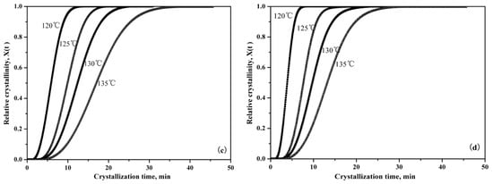 Figure 7 is the representative integral results, showing that relative crystallinity can be expressed as a function of crystallization time during the isothermal crystallization of pure PLLA and PLLA/PLLA-AMPOSS composites. It can be seen from Figure 7 that the curves move to the left with decreased crystallization temperature, which indicates that less time is required to attain the same relative degree of crystallinity. The slope of the isothermal crystallization temperature curve, which is related to the crystallization rate, was also found to be increased with the decreased crystallization temperature. In addition, with a higher content of PLLA-AMPOSS intermediates, an earlier change of crystallization rate takes place, which is in agreement with the previous analysis in Table 2. The efficiency of the PLLA-AMPOSS intermediate was hence further proved.