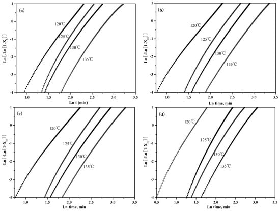 Effects of PLLA-AMPOSS content and crystallization temperature on the Avrami plots of (a) pure PLLA, (b) PLLA/PLLA-AMPOSS1.0, (c) PLLA/PLLA-AMPOSS10, and (d) PLLA/PLLA-AMPOSS30 nanocomposites.