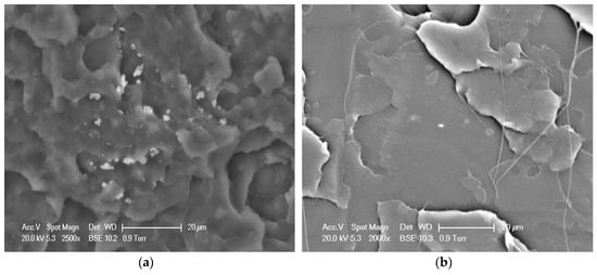 It is known that the dispersion of POSS in the polymer matrix as a dominant role could affect the physical properties of biodegradable polymers. Therefore, the fracture surface morphology of the physical blend of PLLA/AMPOSS and the fabricated PLLA/PLLA-AMPOSS30 nanocomposites samples was determined by SEM, as shown in Figure 9. It can be observed in Figure 9a that several white particles dispersed randomly among the black matrix, which can be realized as AMPOSS nanoparticles, indicating that inhomogeneous dispersion occurred in the simple physical blend of PLLA and AMPOSS, although the content of AMPOSS was as low as only 0.1 wt%. However, compared to Figure 9a, a uniform dispersion of PLLA-AMPOSS can be found in the PLLA matrix and there is good compatibility between copolymerized PLLA-AMPOSS and the PLLA matrix, as shown in Figure 9b.