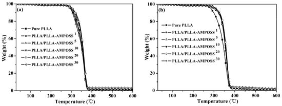 The thermal stability results of the samples tested under nitrogen gas flow and oxygen conditions are plotted in Figure 10a,b, respectively. The thermo-oxidative decomposition temperatures for 5% and 50% weight loss (T0.05 and T0.50) are listed in Table 3. It is obvious that the values of T0.05 and T0.50 for neat PLLA are approximately 295 °C and 392 °C in nitrogen atmosphere, and 286 °C and 346 °C in air atmosphere, respectively, and the value of T0.05 for the PLLA/PLLA-AMPOSS nanocomposites is generally higher than that of pure PLLA. It can be seen in Table 3 that the T0.05 and T0.50 values for PLLA/PLLA-AMPOSS nanocomposites increased 16–25 °C and 8–11 °C, respectively, over the neat PLLA resin. Furthermore, the T0.05 and T0.50 values of PLLA/PLLA-AMPOSS nanocomposites in air atmosphere are slightly higher than those in the nitrogen atmosphere. The residual amount of weight loss is also seen to gradually increase with the increased PLLA-AMPOSS mass fraction. Therefore, a conclusion can be drawn that there was a tremendous improvement in thermal stability when the content of PLLA-AMPOSS intermediates was increased in a range of 0–20%. In addition, the PLLA-AMPOSS intermediate materials had better improvement of thermal and thermo-oxidative stability in air than nitrogen atmosphere for the PLLA matrix. These results can be attributed to three possible reasons. First, the cage structure of AMPOSS possesses higher thermal stability. Second, a superficial silicified film on the PLLA layer produced by AMPOSS can act as a strong barrier prohibiting gas diffusion caused by small molecules of the material in the thermal degradation process, leading to a delay in degradation. Finally, the end carboxy groups of PLLA resin are converted into hydrogen groups after undergoing a reaction with aminos of the AMPOSS, resulting from the promoting effect of the interaction between the PLLA matrix and PLLA-AMPOSS on the formation of hydrogen groups. However, the thermal stability of the PLLA/PLLA-AMPOSS nanocomposites was also somewhat deteriorated when the additional content of PLLA-AMPOSS intermediates exceeded 20%. This means that, compared with the neat PLLA resin, the lower molecular weight of PLLA-AMPOSS plays a dominant role in decreasing thermo-oxidative stability when the content of PLLA-AMPOSS intermediates is 30 wt%.