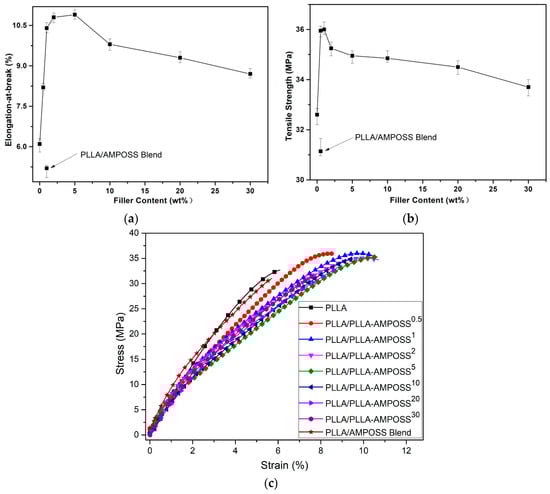 Effects of filler content on (a) tensile strength, (b) elongation at break, and (c) stress–strain plot of PLLA/PLLA-AMPOSS nanocomposites and PLLA/0.1wt% AMPOSS blend.