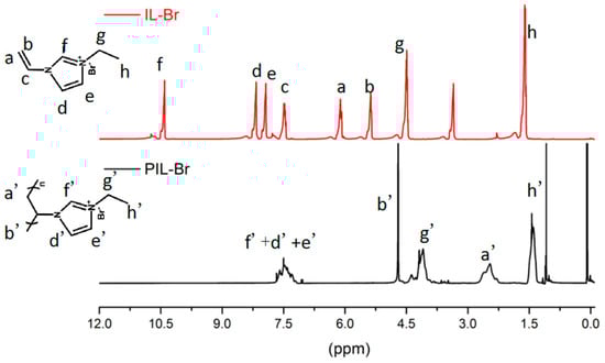 The 1H NMR spectra for PIL-Br and IL-Br is shown in Figure 2 and the chemical formulae are shown in the illustration. The vinyl signals at 7.5, 6.1 and 5.4 ppm are observed to disappear, with the appearance of new signals at 2.7 and 4.5 ppm attributed to the protons of the polymeric backbone. Under the influence of the chemical group, the transformation and shift of signals near 10.5 and 8 ppm are distinct. We ensure that the polymerization by IL-Br monomer is successful via 1H NMR test.