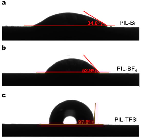 Wetting, usually associated with hydrophilicity, is a phenomenon based on two-phase interface changes from a solid-gas interface to a solid-liquid interface. The wettability of a film material can be expressed by the contact angle (1–180°) and a large contact angle indicates a worse wettability. The static water contact angles for PIL-Br (34.6°), PIL-BF4 (52.9°) and PIL-TFSI (97.8°) are shown in Figure 3, revealing the hydrophilicity: PIL-Br>PIL-BF4>PIL-TFSI. The result corresponds to the effect of the anionic polarity to water molecules in theory.