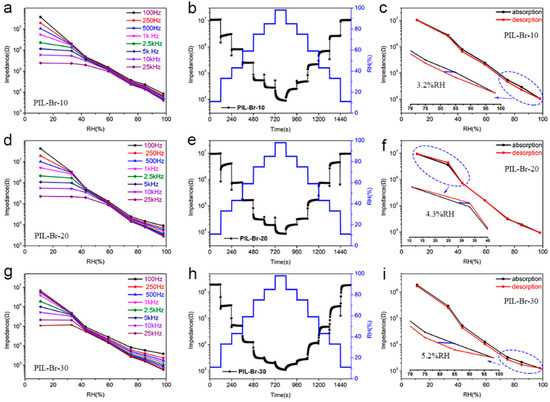 When polymers are used in humidity sensing, the swelling process is usually exploited: (i) diffusion of water molecules through the polymer matrix, (ii) relaxation of polymer chains and (iii) expansion of the polymer network upon relaxation. To confirm that the humidity performance of the PILs can be affected by their swelling behaviour, a series of controllable experiments were exemplified using hydrophilic PIL-Br. Since the swelling behaviour of a PIL sensing film is directly related to its thickness, we thus investigate the effect of PIL-Br thickness on the humidity performance. The thickness of PIL-Br sensing films can be easily controlled by adjusting the concentration of the spin-coating solution, denoted as PIL-Br-10, PIL-Br-20 and PIL-Br-30, respectively. It is well known that the working frequency has an important impact on the humidity performance of a PIL sensor. To explore the optimum frequency for the PIL humidity sensors, we first investigated the impedance as a function of RH at different frequencies. The relationships between the impedance modulus of PIL-Br-10 and RH with measuring frequency from 100 Hz to 25 kHz are shown in Figure 4a. In the low frequency region from 100 Hz to 1 kHz, the PIL-Br-10 sensor presents good linearity with a total impedance modulus change of more than two orders of magnitude, which indicates high sensitivity in the whole RH range from 11% to 98% RH. However, the impedance curve gradually turns flat and the total impedance modulus change is reduced when the measuring frequency is higher than 2.5 kHz. This is mainly because the polarization of the water molecules cannot catch up with the directional change of the electrical field under high frequency and only electronic-displacement polarization and ion-displacement polarization can take place. Since the capacitance and dielectric constant of the PIL sensor is very small, it becomes independent of RH at high frequencies. The best linearity of the impedance versus RH curve for the PIL-Br-10 sensor appears at 500 Hz; thus, 500 Hz was defined as the ideal working frequency for the PIL-Br-10 sensor and was used in the following measurements. Similarly, the optimum measuring frequencies for PIL-Br-20 and PIL-Br-30 can be calculated to be 500 Hz (Figure 4d) and 2.5 kHz (Figure 4g), respectively. The dynamic impedance response of PIL-Br sensors within the step changes from 11% to 98% RH followed by a return to the initial state were also performed, as shown in Figure 4b,e,h. All sensors exhibited a good reversibility during the step change in the humidity levels, revealing good reliability of the as-prepared humidity sensors. In addition, humidity hysteresis—another criterion that is commonly used to estimate the reliability of humidity sensors—was also tested for PIL-Br sensors with varying thickness. The humidity hysteresis is defined as the maximum difference of the humidity sensor between the adsorption and desorption process [26]; thus, the humidity hysteresis was calculated to be 3.2% RH (Figure 4c), 4.3% RH (Figure 4f) and 5.2% RH (Figure 4i) for PIL-Br-10, PIL-Br-20 and PIL-Br-30 within the working range of 11%–98% RH, respectively. This result can further confirm the good reliability of PIL-Br humidity sensors.