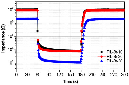 The PIL structure is special because of the many three-dimensional spaces which are due to the staggered connections between the polymer chains, similar to an overpass-type structure. Meanwhile, these three-dimensional spaces are conducive to increase the free volume by absorbing water molecules for current carrier transport. At this basis, the synergistic effect of three-dimensional space and hydrophilic PIL can significantly improve the humidity performance of sensors. For example, the PIL-based humidity sensors exhibit varying sensitivity from 11% to 98% RH at room temperature (25 °C), as shown in Figure 9. Based on the static water contact angle, the hydrophilicity follows the order PIL-Br > PIL-BF4 > PIL-TFSI. Among the PILs in our work, the PIL-Br sensor which has the optimum hydrophilicity possesses a biggest free volume based on the swelling theory. Fortunately, the larger free volume can provide more absorption sites to make water molecules permeate into the PIL film for more carrier transport channels at the same ambient humidity and temperature. Due to the electrostatic fields of the PIL-Br film, the absorbed water molecules will dissociate as 2H2O → H3O+ + OH−. In addition, the conduction in polymer films mainly occurs along the hydrogen bond via hydrogen-ion jumps based on the Grotthuss mechanism, i.e., H2O + H3O+ → H3O+ + H2O. Thus, the PIL-Br film has more free ions and carrier transport channels to achieve outstanding conductivity, high sensitivity and a large response and recovery velocity, which is verified by our experimental data.