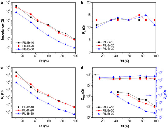 For further discussion, the experimental impedance results obtained for the PIL-Br humidity sensors were fitted via equivalent circuits by using Z-View software, as shown in Figure 7. Here, RS is related to the resistance of the electrode/film, R1 is the bulk resistance of film, ZCPE is a constant phase element (CPE) and ZW is a Warburg impedance [27]. As shown in Figure 7a, the total impedance of the PIL-Br humidity sensors almost achieves a three orders of magnitude response and superior linear correlation coefficient under RH ranging from 11%–98%, which is advantageous for humidity sensors. The values for RS and ZCPE were hardly affected by ambient humidity, as shown in Figure 7b,d, because RS relates only to the inter-contact between the electrode and film and ZCPE is characterized as the influence of polarization in the sensing film. In addition, RW decreases drastically as RH increases from 43% to 98%, leading to high-concentration and fast-action of mobile ions in the diffusing process due to the formation of continuous multi-water layers at 33%RH(PIL-Br-30) or 44%RH(PIL-Br-10, PIL-Br-20). It is worth noting that continuous multi-water layers can promote jumping of hydronium ions (H3O+) and free hydrogen ions (H+) for conduction based on the Grotthuss mechanism [28]. Hydrogen-ion jump conduction occurs when a H+ (H3O+) passes from one end to the other through an adjacent water molecule, rather than a H+ (H3O+) going from one end to the other, with the former being faster. The value of R1 decreases linearly by approximately three orders of magnitude within the full measured RH range (Figure 7c), which can be attributed to the improved conductance of the PIL-Br sensing film because of the increased number of absorbed water molecules. In addition, the results show that it is easy to increase the conductivity in thicker films because of the absorption of more water molecules. In summary, the PIL-Br-30 sensor has pretty outstanding conductivity during the ion diffusion process.