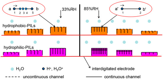 As mentioned above, the conductivity of the PIL is inversely proportional to the viscosity and proportional to the free volume through the free volume theory. At the same time, the free volume of PIL has affinity with moisture. Therefore, the mechanism of the fast response and recovery of the PILs can be explained by the free volume theory, as shown in Figure 10. The response process of the PIL-based humidity sensor is described from low RH to high RH as follows: (i) increase of the free volume of PIL film through combining with water molecules to provide more carrier transport channels, (ii) obtain a high concentration of free ions because of the relaxation and disintegrate effect of the polymer chains and dissociation of the absorbed water molecules and (iii) increased conductivity in a PIL film because of the fast free-ion movements in the channels. The PIL structure including anion types and film thickness affected the free volume of the PIL film at the same ambient humidity at 25 °C; then, the hydrophilic anion and slightly thick film benefits an increase in the free volume. In addition, the magnitude of the free volume of the PIL film can decide the lowest humidity required to achieve continuous multi-water layers for providing more carrier transport channels. Meanwhile, the concentration of free ions including H+, H3O+, Br− and BF4− can increase as the ambient humidity increases. Therefore, our findings develop a new perspective to understand the humidity performance of PILs based on free volume theory and we can rationally design PIL structures including anion types and film thickness to obtain super properties including fast response and recovery in PIL sensing films.
