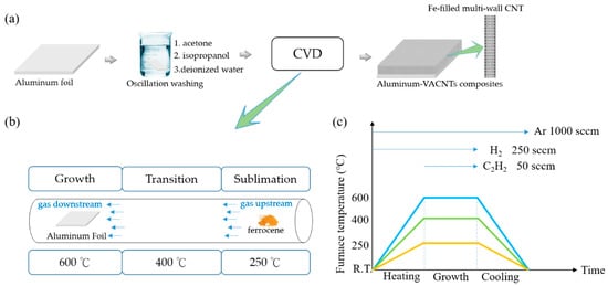 (a) Fabrication procedure of aluminum vertically-aligned carbon nanotube forests (VACNTs) composites; (b) synthesis setup in this experiment employing three-segment chemical vapor deposition (CVD); (c) recipes for the furnace and gas flow.