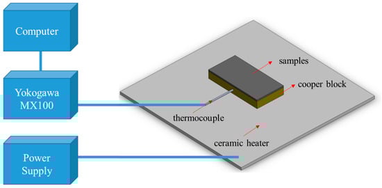 To measure the heat dissipation effects of the various samples on a high-temperature component, each sample with an area equal to the top surface was adhered to the copper block, which was heated to a high temperature and left to cool naturally. A ceramic heating plate was selected as the heating source alongside a power supply to provide energy. After the temperature of the copper block was higher than room temperature by 150 °C, the copper block was left to cool naturally. We considered this temperature sufficient for covering the working temperature range of most electronic components. Before we commenced cooling and recorded the temperature, the ceramic heater was replaced with a well-insulated fiberglass blanket to prevent the system from being influenced by the temperature of the ceramic heater. The temperature-cooling curve was also recorded at the mean time. Regarding temperature measurement, this work used a thermocouple temperature measurement system (Yokogawa MX-100, Tokyo, Japan), which employed a Type T thermocouple to measure temperature at a precision of 0.1 °C per second and was connected to a computer in order to record temperature change over time. Because the data points were highly dense, a mark was shown every 100 s to facilitate observation. When conducting the experiment, the whole system was placed in a closed environment without ventilation to ensure that the only independent variable was the different samples. This process is illustrated in Figure 3.