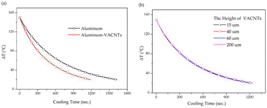 First, we determined whether VACNTs contributed to heat dissipation. Because this work employed aluminum–VACNTs composites materials, and aluminum foil has a horizontal heat-spreading effect, we first compared samples with and without VACNTs on aluminum foil. As shown in Figure 4a, the aluminum–VACNTs composites exhibited a shorter cooling time than did aluminum foil on its own. The amount of time required by the two types of materials to reach a certain temperature differed by approximately 450 s. A preliminary judgment, the VACNTs had an obvious positive-effect on heat dissipation. Notably, the final data point and the environmental temperature differed by 20 °C. From the perspective of thermal equilibrium, the larger the difference between the final data point and the environmental temperature is, the faster the cooling speed becomes; by contrast, a smaller difference indicates a slower heat dissipation speed. Therefore, this work considered that measuring the room temperature from 150–20 °C was sufficient for observation.