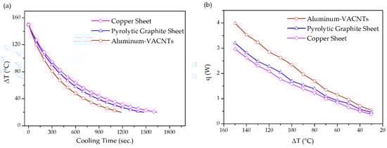(a) The temperature–time curve for the aluminum–VACNTs composites, pyrolytic graphite, and copper sheets subject to natural cooling; (b) relation of temperature change versus heat change for the aluminum–VACNTs composites, pyrolytic graphite, and copper sheets subject to natural cooling.