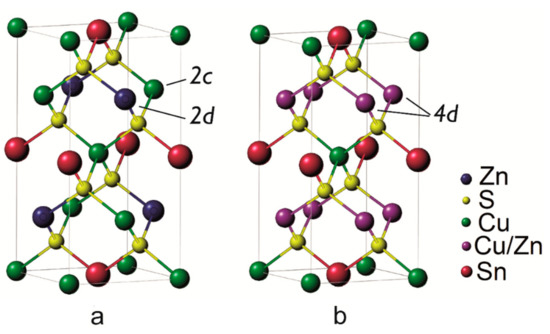Ordered I-4 (a) and disordered I-42m (b) crystal structures of kesterite. In the ordered state Cu and Zn occupy respectively 2c and 2d Wyckoff positions while above the transition temperature, they appear as randomly distributed in the planes of 4d Wyckoff positions [14,15,26].