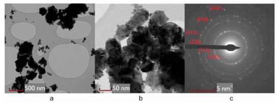 TEM and SAED images: (a,b) TEM images of slowly cooled sample ground to powder; (c) SAED pattern of the area shown in Figure 3a, Miller indices of scattering planes corresponding to a tetragonal crystal structure are indicated.