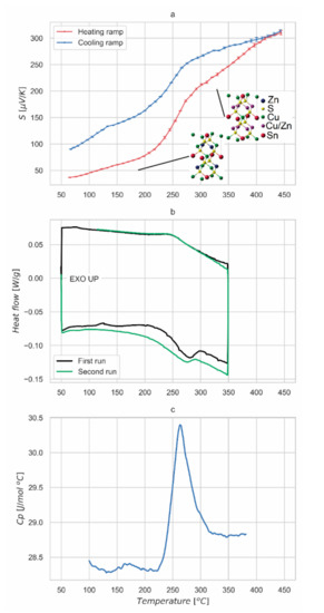 The present work was not aimed at showing a high-performance thermoelectric material, but rather to show the structural information provided by a simple measurement of Seebeck coefficient with the support of thermal analyses. Moreover, the order-disorder transition of kesterite known in photovoltaics was presented from a different perspective, as a proof-of-concept of the possibility to achieve a higher Seebeck coefficient with increased disorder and crystal symmetry. It is however possible to estimate a figure of merit zT at 400 °C for our samples, ranging from 0.025 to 0.04, comparable with the literature values for thermoelectric kesterite at the same temperature [6,7]. For this estimate we used the specific heat of Figure 4 and the published data of electrical resistivity and thermal diffusivity [31]. The latter were recently measured on a kesterite sample obtained with the same process, apart from a faster cooling down process after the thermal treatment; the zT value should be unaffected in any case by the cooling velocity, since the sample at 400 °C is in a complete disordered state. More extensive measurements and developments to improve electrical resistivity and thermal diffusivity of the studied system are part of the ongoing research work.