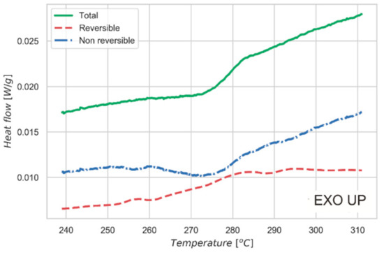Figure 5 shows the data collected by MDSC. The experiment allows us to separate the heat flow curve into two different contributions. One is the step change in heat capacity of the sample due to the order/disorder transition. This effect is reported in the reversible heat flow signal. The second contribution is associated with the enthalpy recovery of the system: this phenomenon is related to the kinetic of the measurement and depends mainly on the thermal diffusivity of the material and on the specimen size and shape. Such a contribution is visible as a peak in the non-reversible curve reported in Figure 5. This behavior is further proof of the nature of the transition observed in the material, which is also confirmed by the constant-pressure heat capacity (Cp) measurement over the same temperature interval. As shown in Figure 4c, a peak of Cp is observed at the order-disorder transition, with a shape characteristic of higher order phase transformations [39]. Cp of the high temperature (disordered) phase is higher than for the low temperature (ordered or partially-ordered) phase, demonstrating an increase in vibrational modes in the disordered phase.