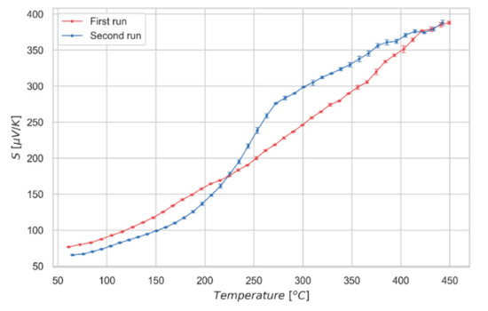 To validate these observations, we measured the absolute Seebeck coefficient of a quenched sample. Quenching was performed from 560 °C, well above the critical temperature, by sudden extraction of the sample from the treatment oven. Due to the fast cooling, we expect the material to be in a fully-disordered state after the treatment. The first run of the measurement of the quenched specimen (Figure 6) shows an approximately linear trend, whereas a second run, made after letting the sample to naturally cool down from the previous measurement, shows the characteristic transition shape at around 250 °C. These results support the idea of a fully-disordered state for the as quenched material (first run), displaying a linear Seebeck coefficient; whereas, upon a slower cooling, kesterite partially recovers the order, displaying a sharp increase of Seebeck value during the second run, similar to the one already observed for the partially-ordered samples of Figure 4a. Further measurements of Seebeck coefficient are reported in the Supplementary Materials to show reproducibility of the analysis and the limited variability of the results.