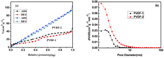 To further investigate the specific surface area and porous nature of the electrospun PVDF membranes, Brunauer–Emmett–Teller (BET) gas sorptometry measurements were conducted. Figure 5 and Figure 6 show the nitrogen adsorption–desorption isotherms and the pore size distribution plots of PVDF membranes. It can be seen that all samples exhibited a type II sorption isotherm, with a hysteresis of type H4, which is characteristic of mesoporous materials [32]. The pore size distribution, derived from the desorption data and calculated from the Barrett-Joyne-Halenda (BJH) model, shows that most of the pore sizes of the electrospun PVDF films with a thickness of 60 μm and 80 μm were between 1 and 5 nm, and the average pore sizes were 4.66 nm and 4.20 nm, respectively, which confirms that the fibers are mesoporous materials. The obtained BET specific surface area, total pore volume, and mean pore diameter of the nanofiber mats for this study are listed in Table 2. It can be seen that the specific surface area increases from 60.68 to 148.10 m2g−1 as the thickness increased from 60 to 80 μm. In the process of electrospinning, the solvent with the larger diameter volatilizes more slowly, and more pores are formed in the process, resulting in a larger specific surface area, which demonstrates that the electrospun PVDF membrane with a thickness of 80 μm has a stronger surface adsorption capacity, which is essential to obtain higher efficiency.