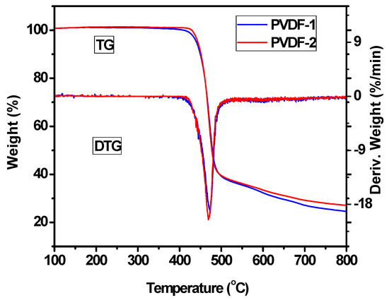 The thermal stability of electrospun PVDF fiber membranes is a crucial property for their long-time use during the operation of DSSCs. Thermal gravity analysis (TGA) is a useful technique to evaluate the changes in the mass of PVDF fiber membranes and their thermal stability. From the TG and differential thermal gravity (DTG) curves, as shown in Figure 6, there is only a single step weight loss, which starts at about 420 °C and ends at about 520 °C and corresponds to the degradation of the main chains of PVDF [31,32]. After degradation, the mass of the PVDF fiber membrane is reduced by 80%. The thermal degradation temperature of the material is very high, indicating that the material has excellent thermal stability. Figure 7 shows the DSC curve of the electrospun PVDF fiber membrane. It can be seen from the figure that the melting temperature (Tm) of PVDF is 167.4 °C, and therefore the electrospun PVDF fiber membrane can withstand a temperature of 110 °C in the hot-pressing process.