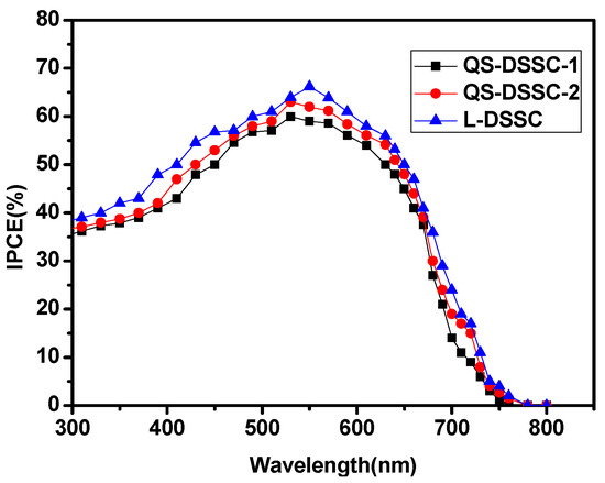The photochemical properties of polymer gel electrolytes were studied by monochromatic incident photon-to-electron conversion efficiency (IPCE) spectroscopy. Figure 10 shows the IPCE spectrum of the DSSCs with quasi-solid-state electrolytes based on the electrospun PVDF nanofiber membranes and ionic liquid electrolyte. The values of IPCE are proportional to the values of JSC. This result supports the J–V characteristics of the DSSCs with quasi-solid-state electrolytes based on the electrospun PVDF nanofiber membranes and ionic liquid electrolytes.
