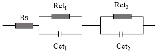In the Nyquist plots, the first small semicircle corresponds to the charge transfer resistance of the Pt/electrolyte interface (Rct1) and the second bigger semicircle corresponds to the charge transfer resistance of the TiO2/electrolyte interface (Rct2).