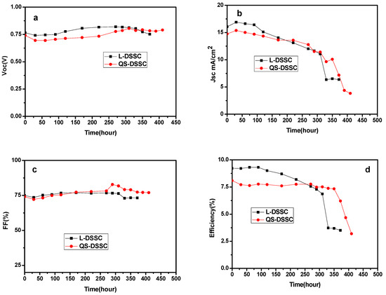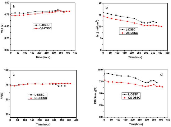 To further compare the stability of the QS-DSSCs and L-DSSCs, stability testing was carried out under outdoor conditions. As can be seen from Figure 14b, the JSC of the L-DSSC began to decline significantly after 310 h, while that of the QS-DSSCs began to decline significantly after 372 h of operation. Under the same sealing conditions, the decline of the JSC may be caused by the volatilization or leakage of the electrolyte. Based on the observations, the efficiency of the L-DSSC, which runs up to 330 h, is only 40% of its original efficiency, while the QS-DSSCs maintain 91% of their original efficiency. At 390 h, the L-DSSC failed, whereas the QS-DSSCs retained 77% of their initial efficiency. Through the comparison of the obtained data, it can be found that QS-DSSCs are more stable than L-DSSCs, since the liquid electrolyte in the outdoor environment is quite volatile and leaky, and following the preparation of the electrospun PVDF nanofiber membrane of the quasi-solid electrolyte effectively solves this problem. The three-dimensional network structure of the electrospun fiber membrane is a barrier to prevent the leakage of the liquid electrolyte, and at the same time, the transfer between holes provides channels for the ions.