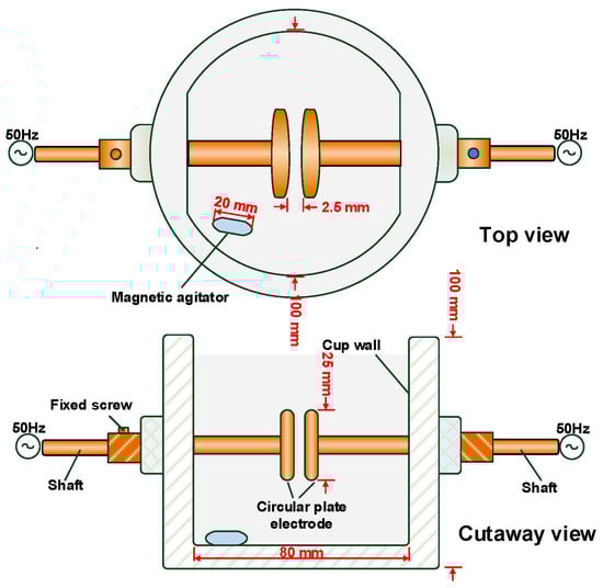 A Portable Oil Tester IJJD-80 (Ruixin Electric, Wuhan, China) (Figure 1) was used to measure AC breakdown voltage according to IEC-60156 []. The gap between the brass electrodes was set at 2.5 mm. A 50 Hz AC voltage with a rising rate of 2 kV/s was applied to the oil cup. The initial standing time was set at 5 min before the application of voltage. The time interval with stirring action and standing time after each breakdown were set at 2 min. Each sample was tested six times, and the average value was taken as the power-frequency breakdown voltage value. All the experiments were performed at room temperature.