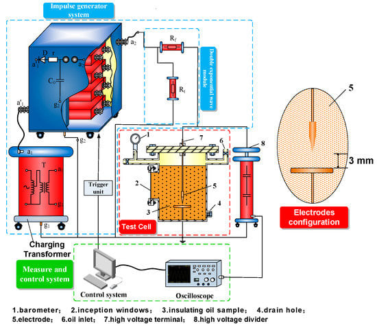 A consecutive impulse generator (30 kJ/400 kV) was used, and voltage signals measured by a high voltage divider were recorded by a TDS2024C impulse analysis system (Xinyuan Electric, Yangzhou, China), as shown in Figure 2.