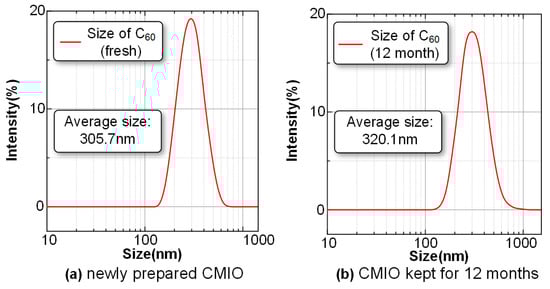 Figure 4 shows that the particle size distribution of the C60 particles in the newly prepared CMIO is mainly concentrated around 300 nm, and 19.7% of the particles have diameters of 290–295 nm. The particle size distribution of CMIO kept for 12 months is also concentrated around 300 nm, in which particles with a size of 290–295 nm account for 18.4%. The average particle size of the newly prepared CMIO is 305.7 nm, whereas the average particle size of the CMIO kept for 12 months is 320.1 nm.