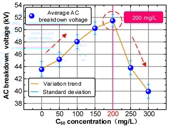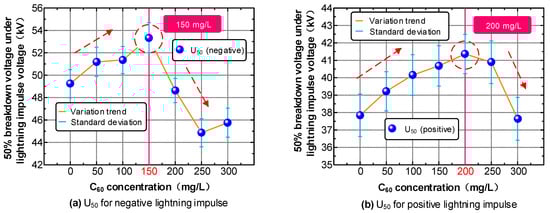The C60 nanoparticles have a positive influence on the impulse breakdown performance of insulating oil, as can be observed in Figure 6. The positive and negative lightning impulse breakdown voltages of CMIO are simultaneously improved. This improvement in negative lightning impulse breakdown voltage was not observed from the traditional nanoparticle modified insulating oil we mentioned before. As shown in Figure 6a, the negative lightning impulse breakdown voltage tends to increase first, then decrease with increasing C60 concentration. However, when the concentration is 300 mg/L, the negative lightning impulse breakdown voltage has a small recovery. The breakdown voltage peaks at 150 mg/L (U50 = 54.23 kV). The positive lightning impulse breakdown voltage also increases first, then decreases with increasing C60 concentration, as shown in Figure 6b. Breakdown voltage reaches its peak value (U50 = 41.36 kV) at 200 mg/L C60 concentration. The breakdown voltage drops sharply after at 250 mg/L C60 concentration, and the positive lightning impulse breakdown voltage is already lower compared with that of FO at 300 mg/L.