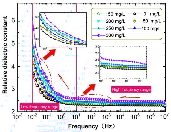 The influence of C60 nanoparticles on the dielectric properties of insulating oil was investigated by measuring the dielectric constants of CMIO samples with different concentrations at different frequencies, as shown in Figure 8.