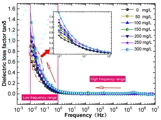According to Equation (5), when changes in γ and εr are not considered, the tanδ is approximately an inverse proportional function of the angular frequency ω, which corresponds to the trend of tanδ with frequency in Figure 9.