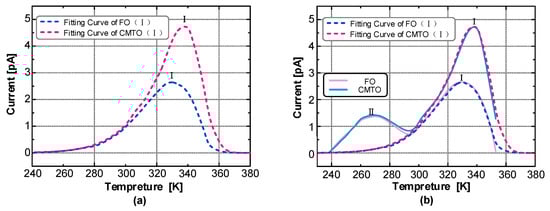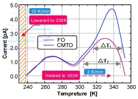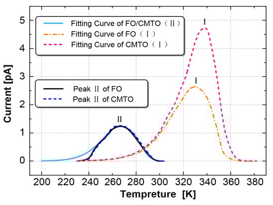 The thermal stimulation currents of CMIO and FO were tested with the TSC test system. The test results are shown in Figure 10.