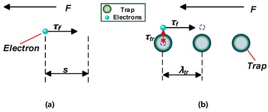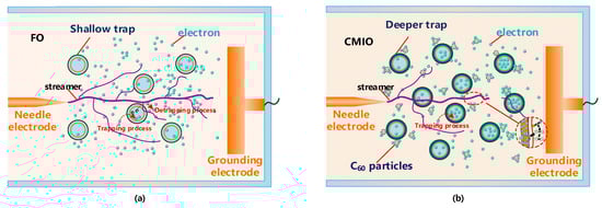 In the development of discharge in FO and CMIO, the motion of electrons can be represented by Figure 19a,b. The trap parameters of insulating oil, and the electron adsorption capacity of C60, and its ability to absorb photons, affect the breakdown performance of nano-insulating oil and the development process of discharging.