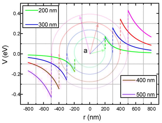 According to the TSC test procedure in Section 4.1 Trap Characteristics, the electric field strength E0=4 kV/mm applied in the experiment, the relationship between the particle size of C60 nanoparticles in CMIO and the electrical potential along the electric field and the central axis can be obtained by using Equations (32) and (33), as shown in Figure 16.