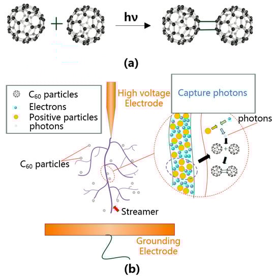 (a) Two C60 molecules absorb photons and form dimer, (b) C60 absorbs photons in the streamer through photopolymerization reaction.