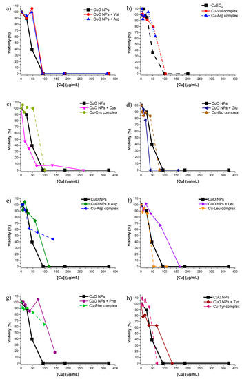 Figure 4. Viability (%) of the Gram-positive bacterium Staphylococcus epidermidis ATCC 35984 vs. copper concentration in (a) pristine CuO NPs, CuO NPs treated with Val and CuO NPs treated Arg; (b) CuSO4, Cu-Val complex and Cu-Arg complex; (c) pristine CuO NPs, CuO NPs treated with Cys and Cu-Cys complex; (d) pristine CuO NPs, CuO NPs treated with Glu and Cu-Glu complex; (e) pristine CuO NPs, CuO NPs treated with Asp and Cu-Asp complex; (f) pristine CuO NPs, CuO NPs treated with Leu and Cu-Leu complex; (g) pristine CuO NPs, CuO NPs treated with Phe and Cu-Phe complex and (h) pristine CuO NPs, CuO NPs treated with Tyr and Cu-Try complex.