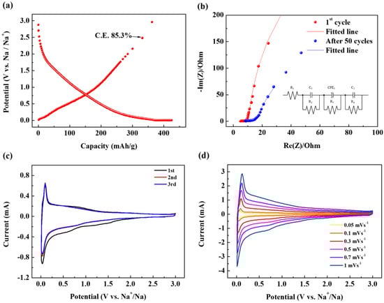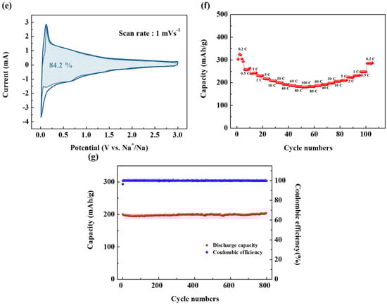 On the other hand, to investigate the surface dynamics of the electrode reaction, an additional CV analysis at a low scan rate (Figure 3d) was conducted. Generally, in lithium and sodium-ion cells, the CV current is represented by a combination of capacitive and intercalation/deintercalation currents. Therefore, the total charge stored on the electrodes can be distinguished by a combination of capacitive and intercalation mechanisms. According to Power’s law, the voltage-current response of electrode active materials at various sweep rates can be summarized as follows:
