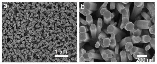 The SEM microstructures of the ZnO nanorods assembly at low and high magnification are presented in Figure 1. From the top view of the as-deposited sample, the nanorods appear to exhibit growth in a direction that is almost perpendicular to the substrate surface. The electron microscopy also revealed well-faceted hexagonal growth with an area density of ~15/µm2. The diameter and length of the nanorods was in the range of 100 to 150 nm and ~1 µm, respectively. The characteristic features of the nanorods assembly such as aspect ratio, area density, and degree of alignment depend on the crystalline quality of the seed as well as the processing conditions [38,39]. The faceted, hexagonal morphology becomes more evident at high magnification (Figure 1b). The deviation from ideal vertical growth of the ZnO nanorods and the not-so-perfect c-axis orientation (noticed in the XRD pattern) are caused by the polycrystalline nature of the ZnO seeds [40].