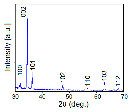 The values of the texture coefficient (TC) for the (100), (002), (101), and (103) diffraction peaks and the crystallite size (D) corresponding to the most intense (002) peak were calculated through Equations (1)–(3). The strain induced in the film due to lattice distortions, as determined using the Williamson–Hall method, is a function of line breadth (βhkl) and diffraction angle (θ) as given by Equation (4) [43,44,45],