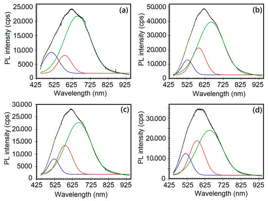An investigation into the film thickness (70–220 nm) and annealing temperature (200–900 °C) effects on the atomic layer deposition ZnO films revealed green, orange, or red emission due to transition of the photoexcited electrons from the CB (conduction band) (2.17 eV) to VO, Zni to Oi (interstitial oxygen) (2.09 eV), or from the CB to the mid-gap states (1.79–1.99 eV), respectively [22]. The lattice disorder or structural imperfections such as grain boundaries and surface defects in the ZnO crystals give rise to Oi and OZn oxygen antisites, thus causing orange/red emission [23]. Various mechanisms have been proposed for green emission based on VZn, VO, Zni, and Oi, or OZn and Oi antisites [23,24,25,26,27]. Other mechanisms that may be active involve substituted Cu atoms at significantly high concentration, shallow donor to deep acceptor electronic transitions [25].