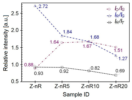 The change in intensities of the orange (IO), red (IR), and green (IG) emissions relative to the green or total spectral emissions, in terms of the IO/IG, IR/IG, and IR/IT ratios, are depicted for different ZnO nanorods samples in Figure 5. Upon Ar/SF6 plasma treatment, the intensity of red emission decreased from 2.72 (for the as-deposited sample) to the minimum value of 1.27 (for 20 min treatment) with an associated increase in the orange emission intensity. The sample Z-nR5 exhibited the greatest extent of reduction in the NBE intensity as well as the maximum enhancement in the broad emission in the visible range with the latter arising mainly from deep level emissions due to zinc vacancy related defects. It is understandable SF6 plasma generates SF6+ radicals that effectively passivate the ZnO surface through saturation of dangling bonds and diminishing the VO concentration [31].