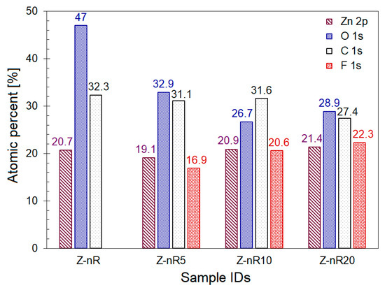 In order to elucidate the PL emission behavior, XPS analyses were performed on the different ZnO nanorods samples before and after plasma treatment. The elemental composition (in atomic percent) of the different surfaces before and after plasma treatments are shown in Figure 6. While the oxygen content was found to decrease with increasing duration of the mixed Ar/SF6 plasma treatment, presumably due to incorporation of F at the surface region, the latter increases as the treatment time increases. There was no sulfur detected on any of the Z-nR5, Z-nR10, and Z-nR20 surfaces (after Ar/SF6 plasma treatment), implying that there are more F ions in the plasma (SF6) than S. Also, the reactivity of F ions is greater and stronger than that of S ions. The carbon element was also present in all the samples, it is attributed to the adsorbed carbon due to contamination.
