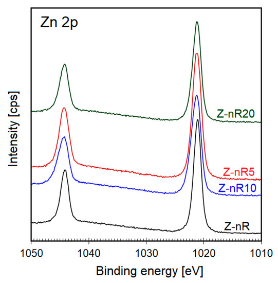 The high-resolution XPS spectra of the as-deposited and plasma functionalized Z-nR samples of Zn 2p peaks are presented in Figure 7. The Zn 2p core lines of the Z-nR sample (no plasma treatment) comprise two distinct peaks that may be ascribed to the Zn 2p3/2 (1021.4 eV) and Zn 2p1/2 (1044.5 eV) with a spin–orbital splitting (Δ metal) of 23.1 eV. This is a direct confirmation of the Zn atoms to be in 2+ oxidation state [54]. From Figure 7, a slight shift of 0.2 V in the peak position towards higher binding energy values was noticed upon Ar/SF6 plasma treatment, possibly due to F− ion incorporation into the ZnO lattice in the near-surface region thus causing the ZnO electronic band structure to be altered. Since electronegativity value for the F− (3.98) is greater than that of O2− (3.44), the net charge transfer from Zn (1.65) to F will be more dominant than that from Zn to O. Nevertheless, the value of Δ (metal) remained constant for all of the samples, indicating that the subatomic structure and the core-level of Zn in the ZnO host lattice is independent of the F from the plasma treatment [57,58].