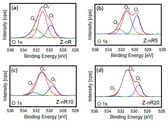 XPS O 1s deconvoluted core level spectra of (a) as-prepared ZnO NRs and ZnO NRs treated in Ar/SF6 plasma: (b) Z-nR5, (c) Z-nR10, and (d) Z-nR20.
